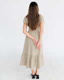 - Maxi dress in a beige plaid pattern perfect for fall