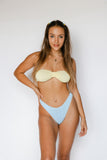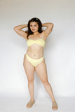 A strapless top that can be worn 2 ways- with the bow front or as a regular straight cut bandeau. Made with luxe crinkle textured fabric in the perfect light yellow color.
