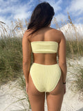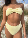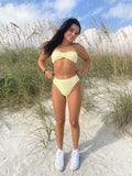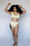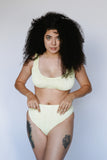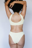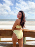 Mid-rise bottoms with cheeky to full coverage. Made with luxe crinkle textured fabric in the perfect light yellow color.
