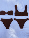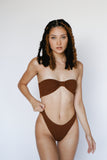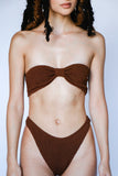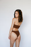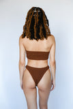 The most flattering high-cut cheeky bottoms. Made with luxe crinkle textured fabric in the perfect chocolate brown color.