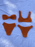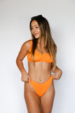 Our classic scoop neck bikini top. Made with luxe crinkle textured fabric in the perfect orange color.