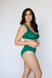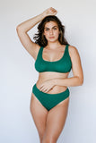 Our classic scoop neck bikini top. Made with luxe crinkle textured fabric in the perfect forest green color.