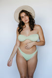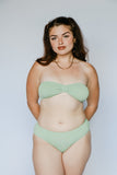 A strapless top that can be worn 2 ways- with the bow front or as a regular straight cut bandeau. Made with luxe crinkle textured fabric in the perfect sage green color.