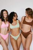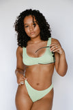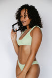 Our classic scoop neck bikini top. Made with luxe crinkle textured fabric in the perfect sage green color.