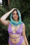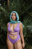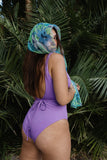 The Rae One Piece has a ruched adjustable underbust, wrap-around tie strap, and a low scooped back. It also comes in two coverage options- mini and moderate (the model pictured is wearing the moderate option).
