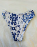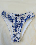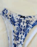 - Blue toile vintage floral print bikini top with dainty blue bows