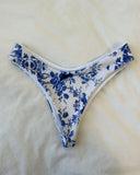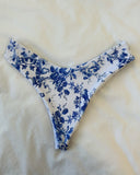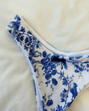 - Blue toile vintage floral print bikini top with a cute blue bow