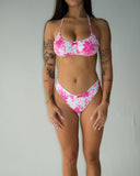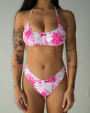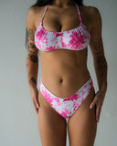 - Pink toile vintage floral print bikini top with a dainty pink bow