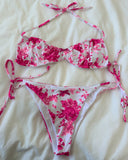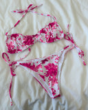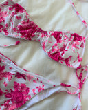 - Pink toile vintage floral print bikini top with a cute pink bow