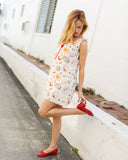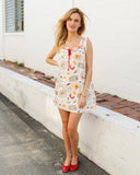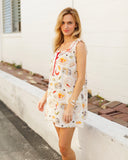 • Our best selling mini dress with a fun dinner party print featuring sardines, peaches, chilies, and olives